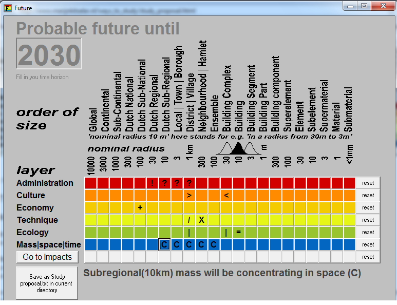 Impacts 2030 Global(10000km) Continental(3000km) Subcontinental(1000km) National(300km) Subnational(100km) Regional(30km) Subregional(10km) Town(3km) District(1km) Neighbourhood(300m) Ensemble(100m) Buildingcomplex(30m) Building(10m) Buildingsegment(3m) Buildingpart(1m) Buildingcomponent(300mm) Superelement(100mm) Element(30mm) Subelement(10mm) Supermaterial(3mm) Material(1mm) Submaterial(<1mm)